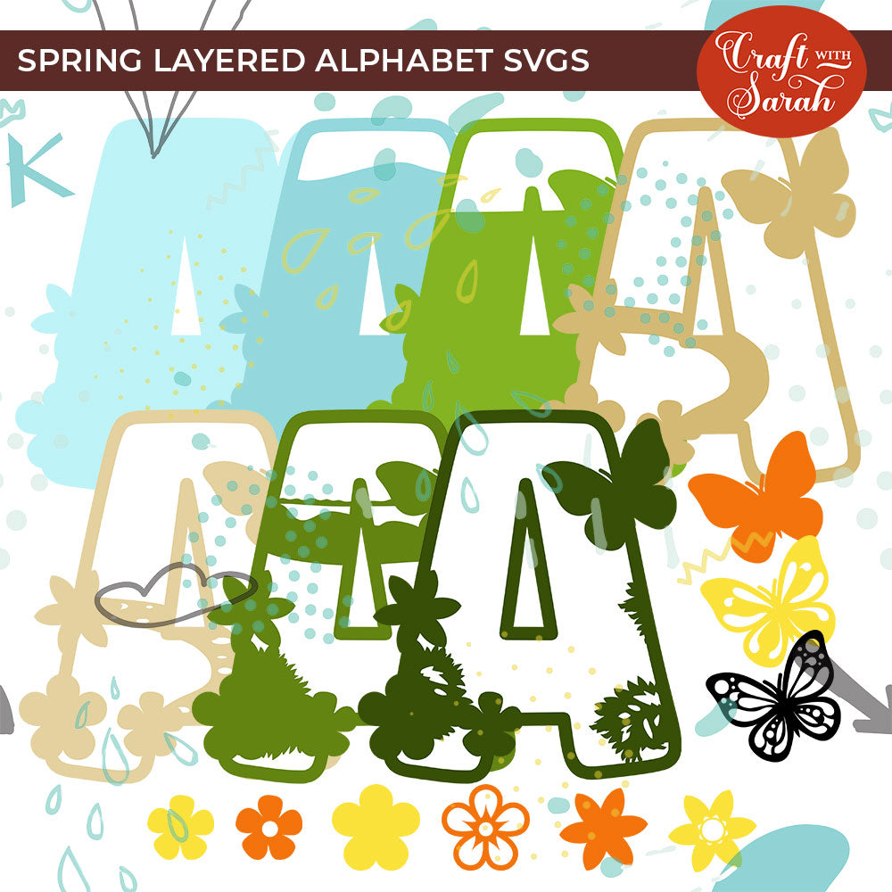 A layered alphabet with a Spring themed design showing green fields and bushes with a stone path down the middle and a blue sky in the background.
