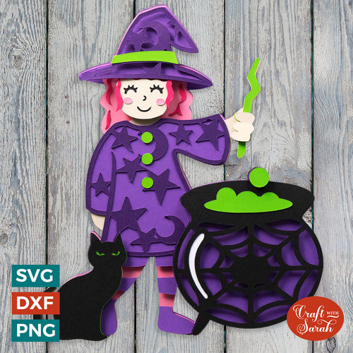 • Halloween Witch SVG | 3D Little Witch with Cauldron & Cat SVG