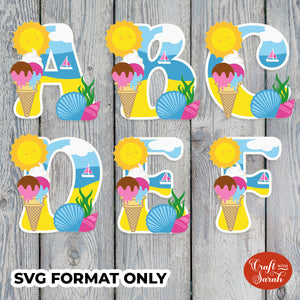 A layered alphabet with a Summer themed design showing the beach with sand and ocean.