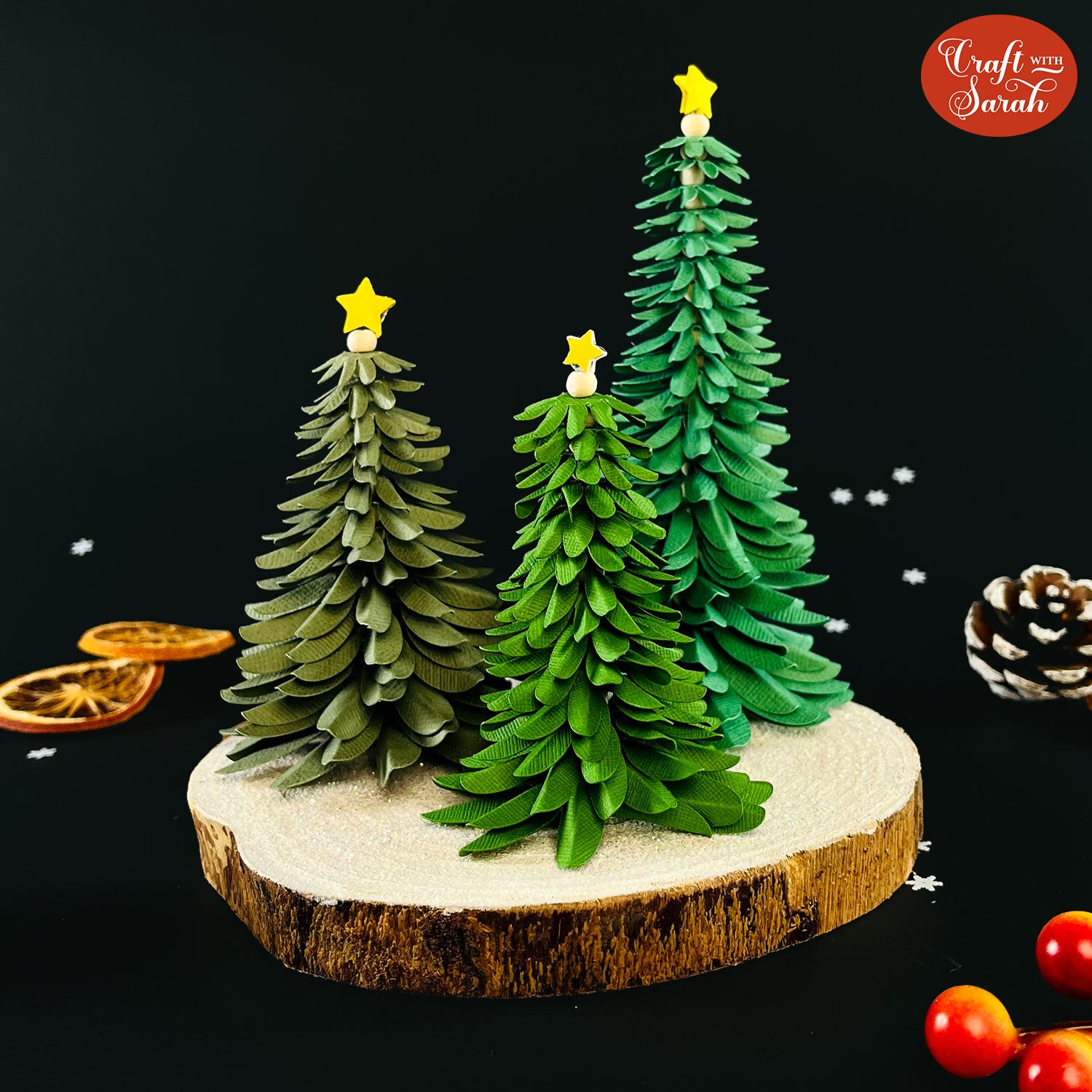 This 3D tree SVG uses lots of pieces to fill out the branches of the tree which come together to make a full Christmas tree. Each piece is threaded onto a piece of wire to stand the tree up.